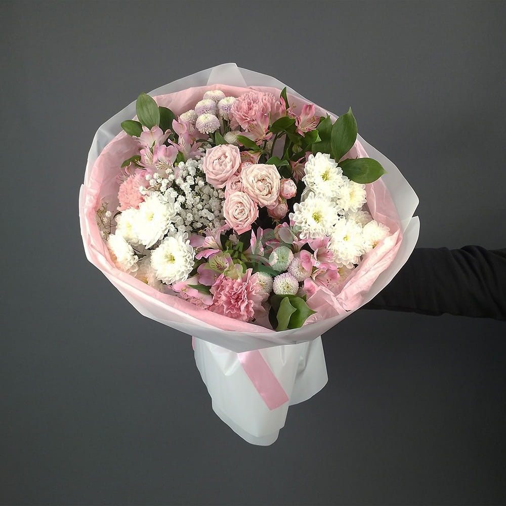 Хризантемы и герберы славятся своей стойкостью, поэтому этот букет будет радовать не один день и не огорчит осыпавшимися лепестками на следующее утро после доставки.