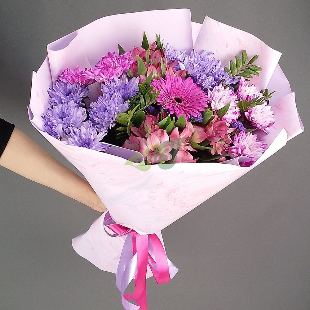 “Вивальди” – наполненная нежностью композиция из цветов всех оттенков фиолетового цвета. Для ее создания использовались прекрасные хризантемы, роскошные бутоны роз, утонченная астра, фитоспорум, альстромерия.