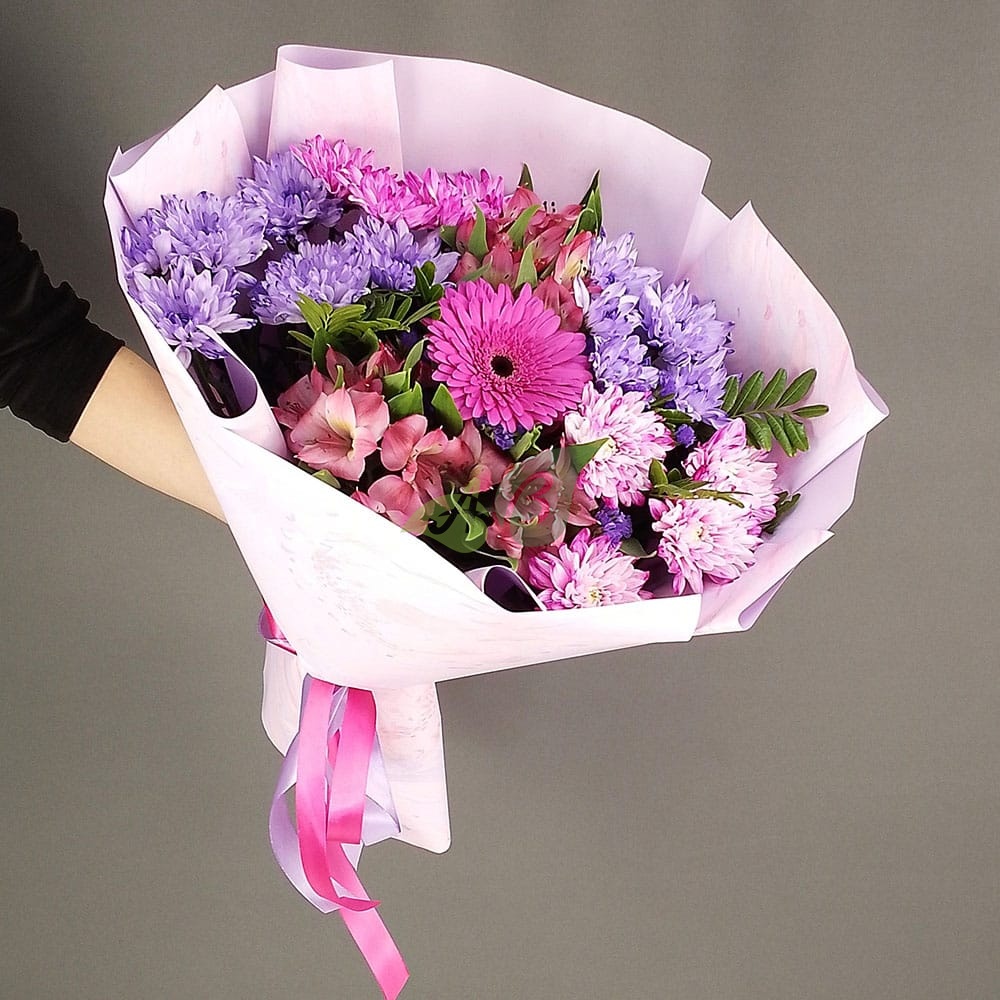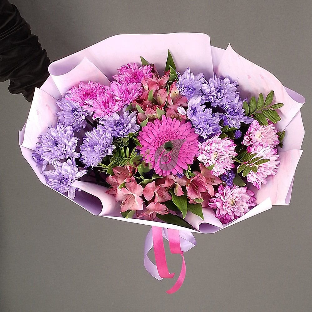 Идеальный букет цветов с доставкой – из микса хризантем и розовых альстромерий в композиции “Яркое сияние”. Сочетание сиреневого и розового цветов с малиновой герберой делают его ярким и нетривиальным.